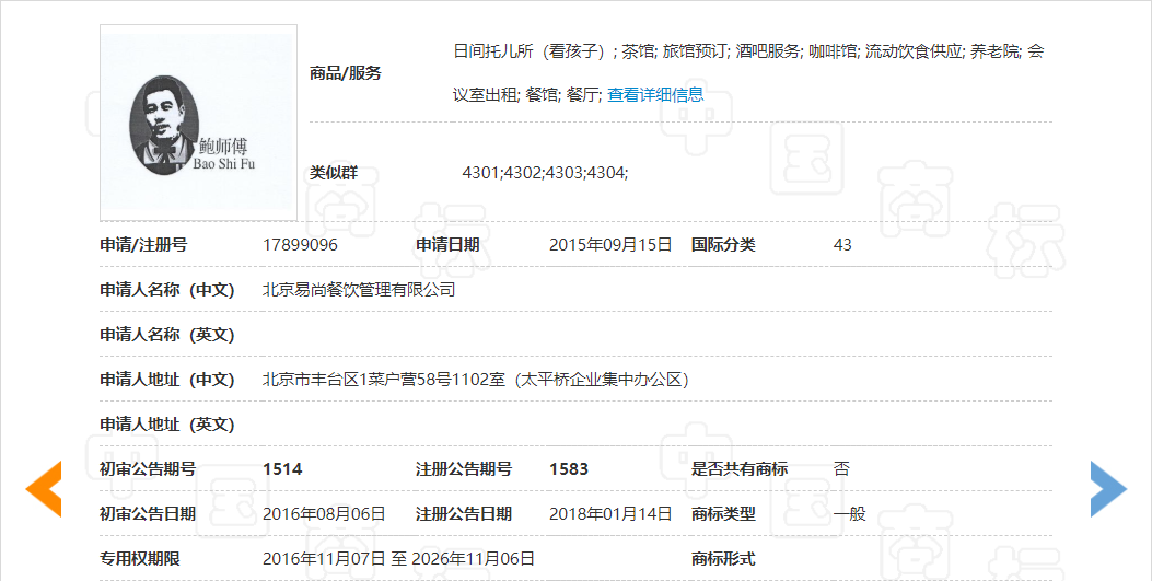 鲍师傅糕点由鲍才胜2004年在北京创立,原名“鲍仔西饼屋”,后考虑鲍仔总会变老,2005年更名为“鲍师傅”,并与2015年创立北京鲍才胜餐饮管理有限公司,2017年通过转让方式获得30类第12484211号“鲍才胜”商标,使用范围包括糕点、面包、蛋糕、饼干、布丁等,然而,北京易尚餐饮管理有限公司成立于2013年,先后注册了43类第17899096号“图像+鲍师傅BaoShiFu”商标,使用范围包括餐馆、餐厅等,傻傻分不清楚!