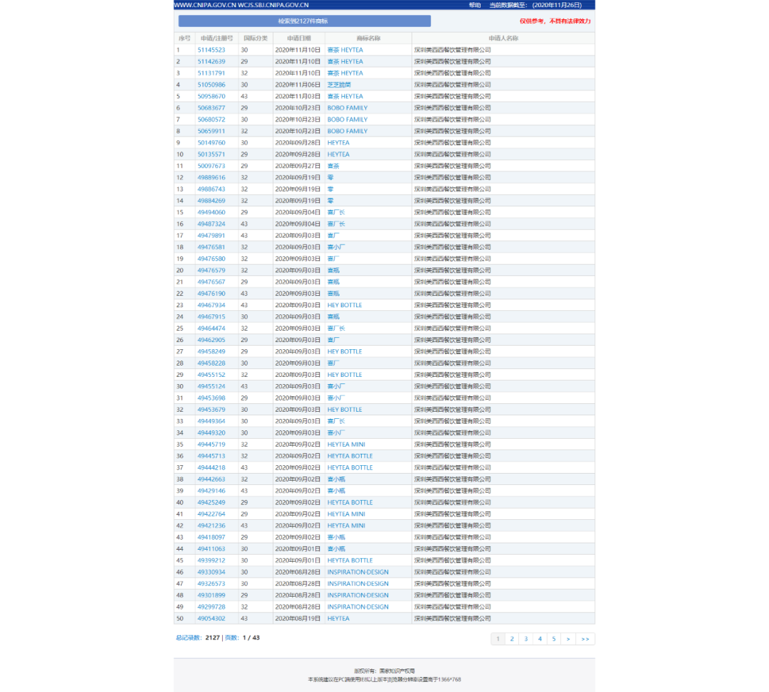 喜茶,原名皇茶ROYALTEA,由聂云宸2012年于广东江门创立,由于无法注册商标,在不受法律保护情况下山寨林立,2016年更名“喜茶HEYTEA”。经历商标之疼后,喜茶开始修筑自己的“商标护城河”,先后注册了数千个商标,而且,根据品牌新业务布局,也会率先注册商标,生意未做,商标先注。